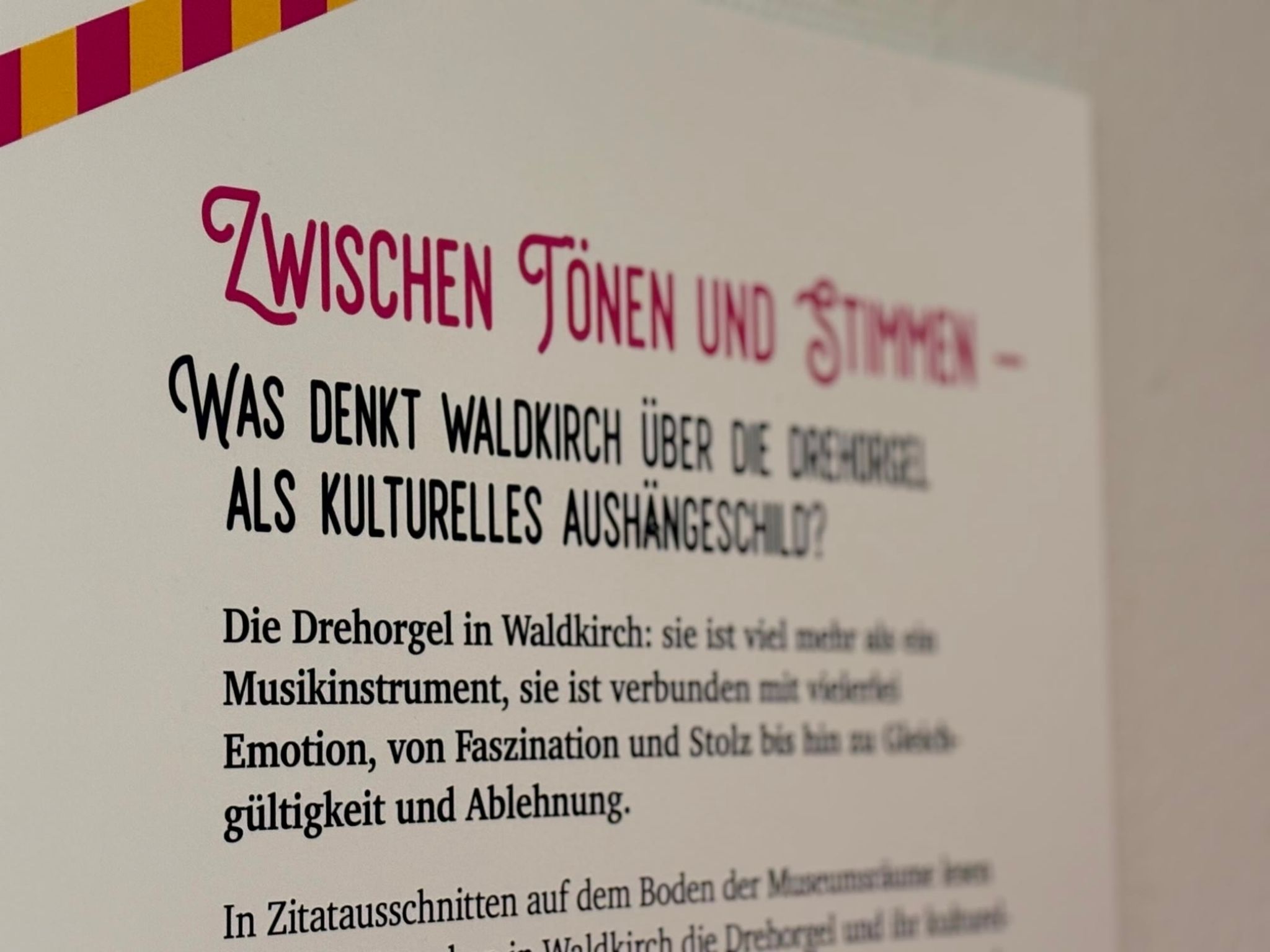 Es sei keine Ausstellung im klassischen Sinn, betonte Museumsleiterin Angela Witt-Meral bei ihrere Begrüßung. Die Studierenden haben punktuelle Interventionen mit magenta-pinker Schrift in verschiedenen Räumen des Museums platziert. Diese beleuchten einzelne Aspekte der Waldkircher Orgelgeschichte. Zitate von Waldkircherinnen und Waldkircher auf Böden und Treppenstufen verbinden die Stationen – Besucherinnen und Besucher „stolpern“ im Elztalmuseum also wortwörtlich über das Waldkircher Orgelerbe.