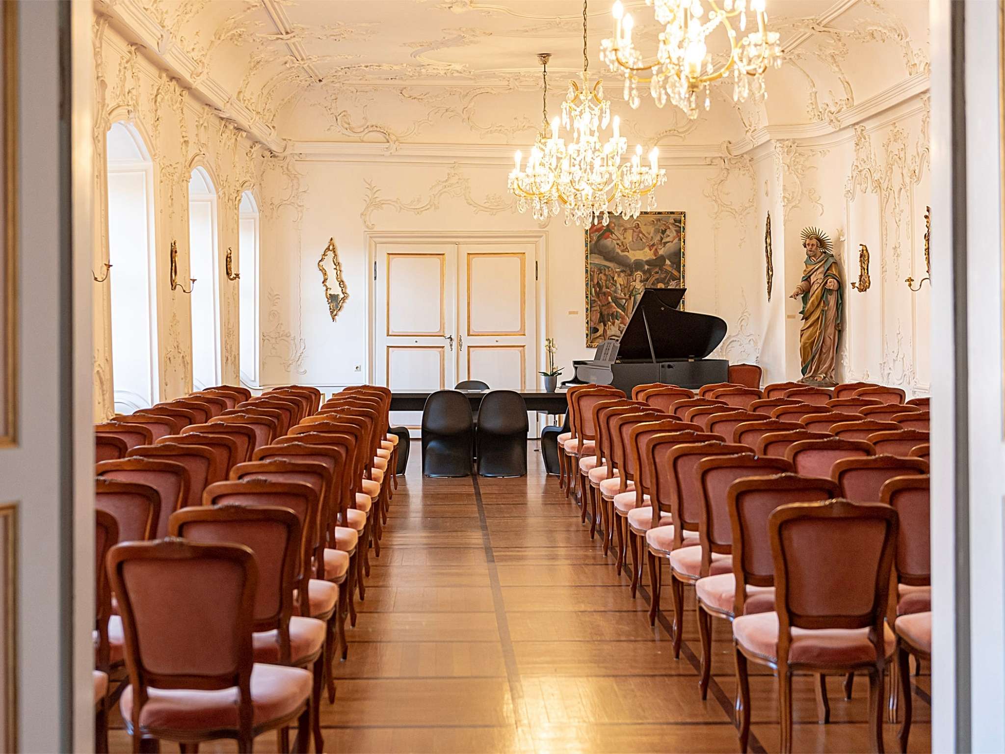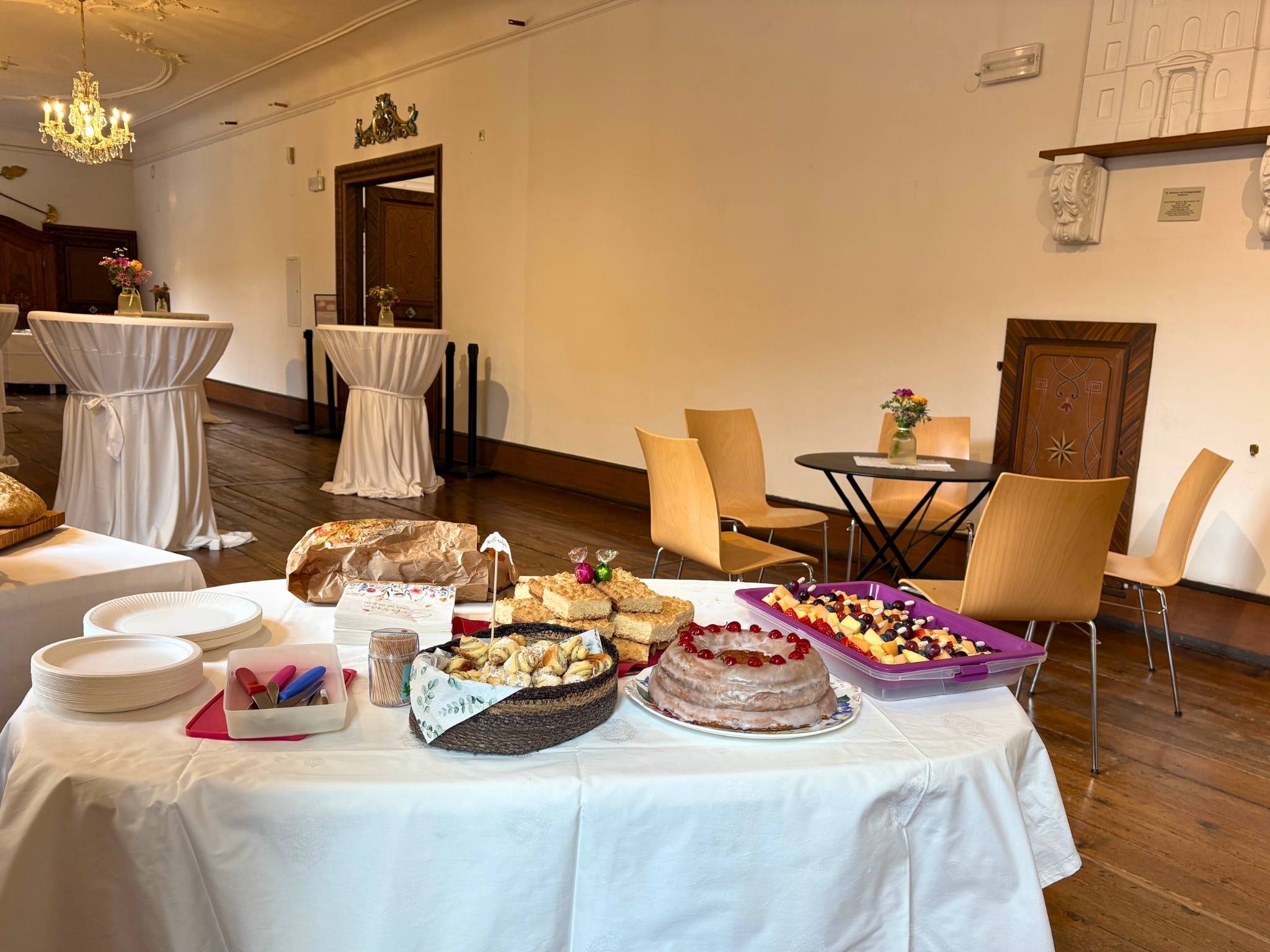 Mit seiner eleganten Architektur und den hohen Fenstern verleiht der Barocksaal jedem Anlass eine besondere Atmosphäre. Bis zu 90 Personen finden hier Platz für Empfänge, Konzerte, Vorträge oder festliche Feiern. Der Saal aus dem 18. Jahrhundert beeindruckt durch seine feine Akustik, stilvolle Ausstattung und seinen einzigartigen Charme – ein Ort, an dem Geschichte und Gegenwart auf eindrucksvolle Weise zusammentreffen.