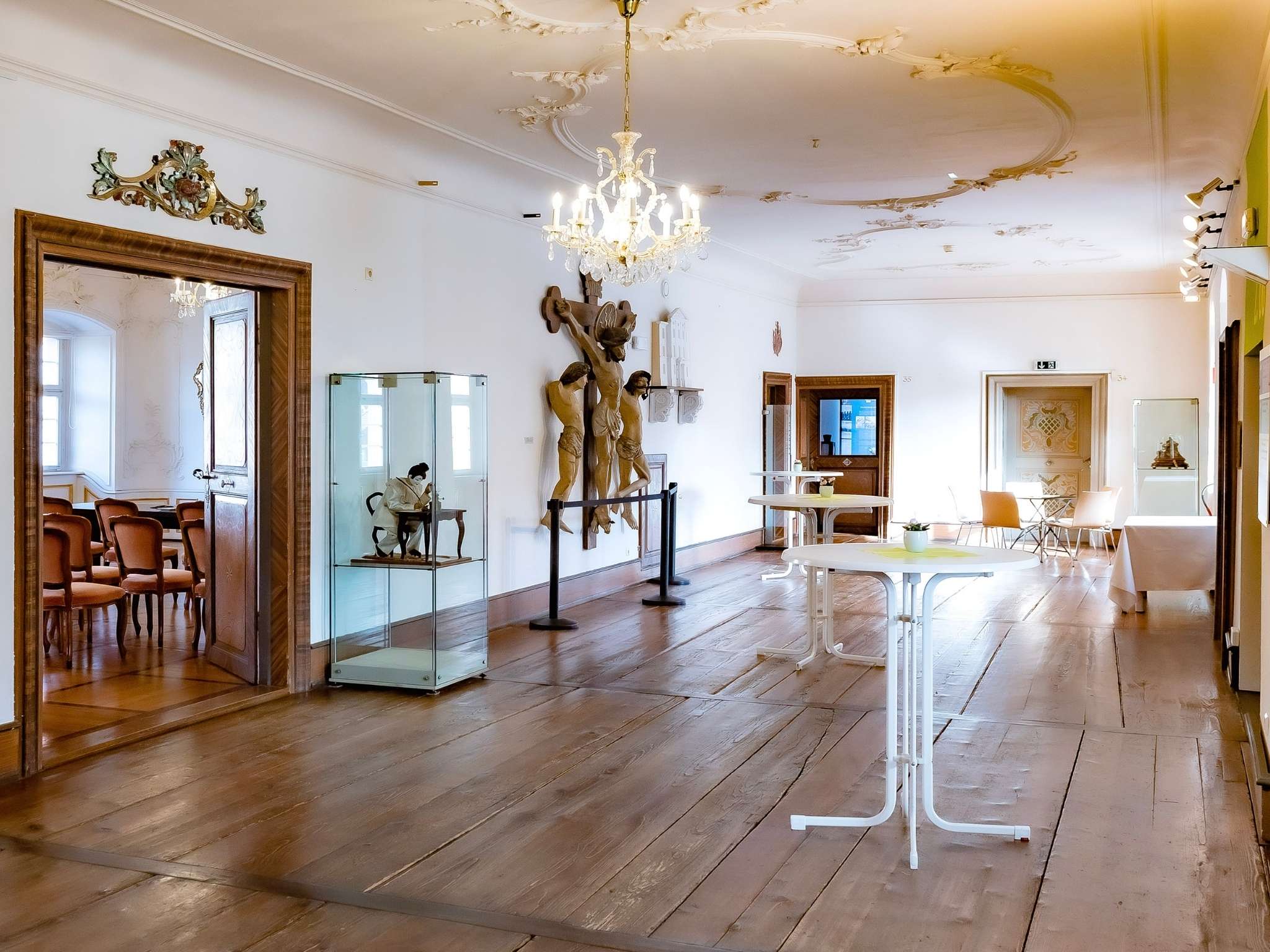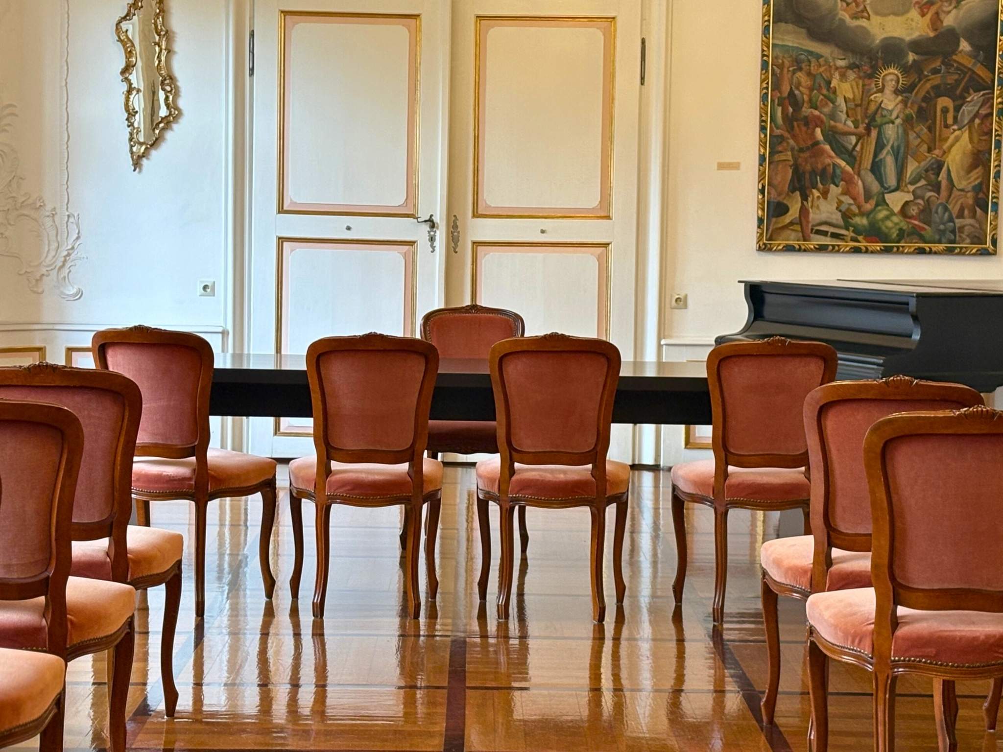 Mit seiner eleganten Architektur und den hohen Fenstern verleiht der Barocksaal jedem Anlass eine besondere Atmosphäre. Bis zu 90 Personen finden dort Platz für Empfänge, Konzerte, Vorträge oder festliche Feiern. Der Saal aus dem 18. Jahrhundert beeindruckt durch seine feine Akustik, stilvolle Ausstattung und seinen einzigartigen Charme – ein Ort, an dem Geschichte und Gegenwart auf eindrucksvolle Weise zusammentreffen.